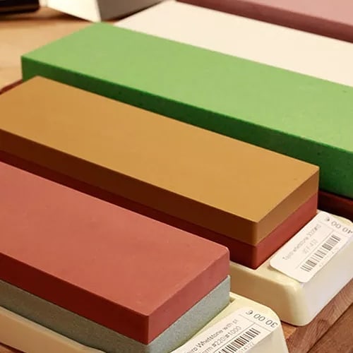 Zunächst sollten Sie wissen, dass der Schärfwinkel japanischer Modelle in der Regel 10–15° beträgt, während westliche Modelle 20–25° haben. Am besten eignen sich Schleifsteine zum Schärfen japanischer Messer. Sie sind in verschiedenen Körnungen erhältlich: grob (200–800er Körnung) zum Auffrischen sehr stumpfer Klingen, mittel (1000–3000er Körnung) zum Grundschärfen und 5000–8000er Körnung zum Polieren und Feinschärfen. In unserem Shop finden Sie doppelseitige Wassersteine mit einer Seite 220er und einer Seite 1000er Körnung. Es gibt auch Modelle mit den Körnungen 1000/6000 und 3000/8000.