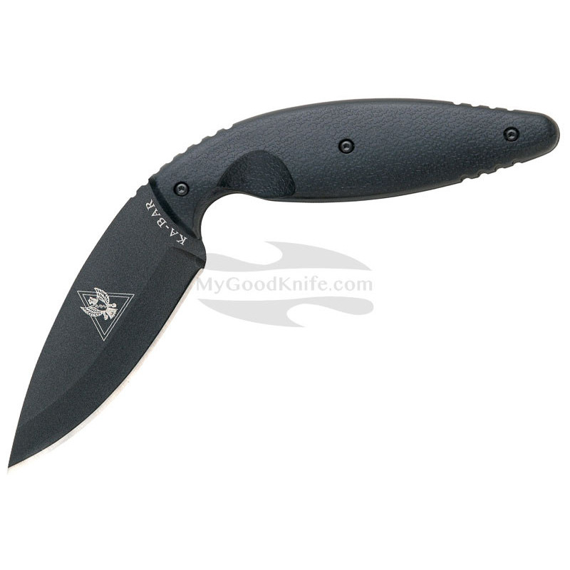 Ka-Bar TDI Law Enforcement fixed knife is 7 5/8" overall. Knife has 3 5/8" black powder coated AUS-8A standard edge stainless drop point blade, full tang and black Zytel handles. Hard plastic friction sheath that is fitted with nylon/cordura MOLLE straps. The TDI Law Enforcement Knife was designed to be used as a "last option" knife. In extreme close quarters encounters where a suspect is attempting to take an officer's handgun, or the officer cannot access his/her handgun, the TDI knife is available. Designed as an "off hand" knife that draws like a pistol, the reversible sheath can be worn on either the right or left side of the officer's belt.