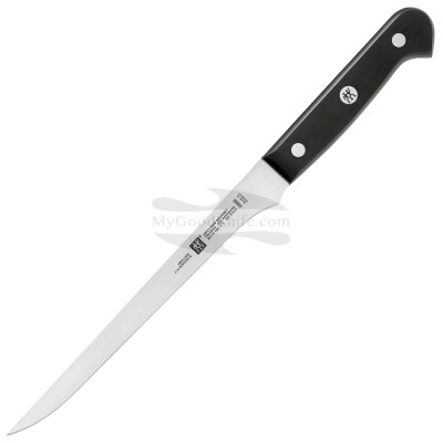ZWILLING J.A. Henckels Gourmet Filleting knife 18 cm. ZWILLING® Gourmet is the go-to knife for home chefs eager for their everyday knife to be exceptional. The single-piece, precision-stamped blade construction is lighter than forged knives, allowing for maximum maneuverability. Proudly crafted in Germany, the knives are made of special-formula steel that has been perfected for over 285 years. Combined with ZWILLING's signature ice-hardening technique, the blades are harder, sharper, they will not stain or chip and they retain their sharpness longer. The ergonomic, triple-riveted handle ensures fatigue-free cutting. Experience the comfort, durability, and sharpness of ZWILLING Gourmet.
