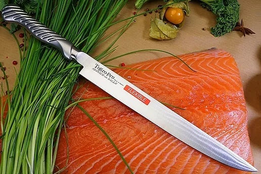 Para pescados grandes, como el salmón, existen cuchillos para filetear específicos, con hojas de unos 30–35 cm. Un modelo con la punta redondeada, por ejemplo, es presentado por Tojiro como cuchillo para salmón, mientras que los fabricantes europeos suelen llamarlo cuchillo jamonero. En realidad, el mismo modelo sirve perfectamente para ambos usos. Las hojas de estos cuchillos suelen tener cavidades o alveolos para evitar que el alimento se adhiera durante el corte.