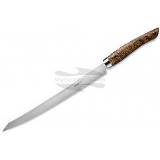 Nesmuk SOUL Slicer with its 160 mm long flexible blade (flat grinding) is allowing for delicate work like filleting fish and meat or slicing vegetables and fruit. The slicer is also great for slicing bacon and ham wafer-thin. Nesmuk SOUL thanks to the element Niob contained in the steel, allows extreme sharpness and excellent durability not attainable with common steel alloys. The Nesmuk SOUL collar is made of high-gloss polished stainless steel. Ergonomic and solid handles for fatigue-free working. The shape of the Nesmuk handle is as aesthetic as it is practical. For the wooden handles, Nesmuk uses only the best, often hand-picked pieces of exquisite quality and certified origin. With wood as a naturally grown material, each handle is unique due to its individual grain, shades of colour and bullet holes. The handl of Nesmuk SOUL slicer is made of Grenadilla wood. Each Nesmuk SOUL is shipped in a high-quality, matte box and certificate of authenticity. There are only best kitchen knives in MyGoodKnife’s range.