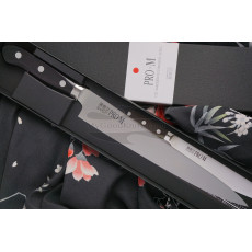 Sujihiki Mcusta Zanmai Classic Damascus with 24cm blade. “Sujihiki” translates to “Flesh Slicer” and it does exactly what the name suggests, perfect for carving and slicing roasts, turkey, raw meats, fish, and all other proteins and the extended blade length allows you to slice with one long stroke, instead of sliding the knife back and forth in a sawing motion. Making clean slices of brisket or ultra thin applications like Carpaccio a breeze to execute. Mcusta Zanmai Classic features a beautiful 33-layer Damascus design, encased with a high quality 'super steel' VG-10 core for ultimate sharpness and long lasting edge retention. 61 Rockwell blades display hardness, toughness, and flexibility. The handle is made from Corian, a composite material that consists of 2/3 natural minerals and 1/3 acrylic with pigment. Blade length: 24 cm. Handcrafted in Seki city, Japan.