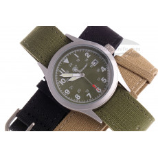 The Dakota Light Backpacker is a watch to help you take exciting hikes in the woods or mountains. This watch has a moss-colored aluminum case and a stainless steel frame. The dial and hands are equipped with Moonglow Electro luminescent lighting. The watch has a khaki-colored dial with black numerals, three hands and a date indicator. This watch has a green nylon key chain to which a black plastic carabiner is attached. The backpacker is waterproof up to 30 meters. Delivered in a wooden gift box.