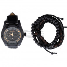 The Remington Gift Set, containing a watch and bracelets in black, is a great way to show that you care about a person, or just to please yourself. The watch is waterproof and shock-resistant, which is helped by tempered and scratch-resistant mineral glass. The strap is made of genuine black leather, which makes it perfectly match with leather and bead bracelets included. The Japanese movement is responsible for the unwavering performance of the dial, finished in black with rose gold hardware.