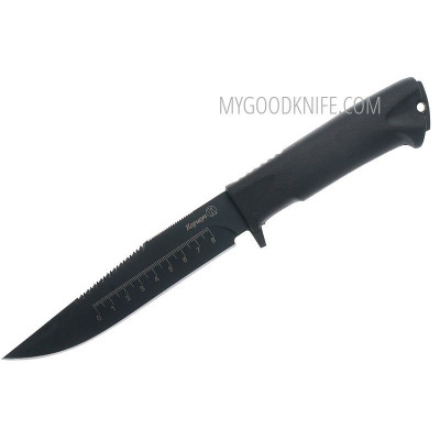 Kizlyar Korshun P on taktinen puukko 16,3 cm:n pituisella terällä. Veitsen hamara on osittain hammastettu.