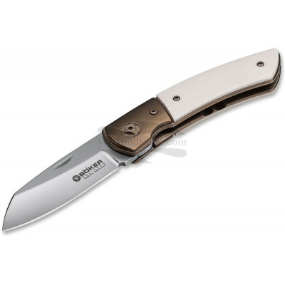 Böker Model 10 folder is a particularly exclusive version from Les Voorhies, which has ivory-like Elforyn handles that contrast strongly with the bronze anodised titanium bolsters. The ball-bearing Wharncliff blade made of CPM-154 is opened by a nail nick and locked in place by a stable linerlock. The plates and the spacer are also made of anodized titanium and complete the noble appearance of the pocket knife. Without clip. Böker Model 10 Elforyn has a weight 104 g.