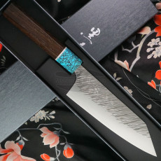Клинок Itamae бунка бочо длиной 196 мм изготовлен из трехслойной стали, состоящей из сердечника Aogami Super Blue и слоев нержавеющей стали SUS410. Эта классическая трехслойная конструкция позволяет внешним слоям защищать и поддерживать центральный слой из сверхтвердой углеродистой стали, образующий режущий край. Лезвие имеет исключительно тонкую и прямую шлифовку, что обеспечивает превосходную режущую способностью Красивая рукоять Itamae бунка из прочного стеклотекстолита G10 выполнена в форме октагон (восьмиугольная конструкция). Нож рекомендуется мыть вручную.